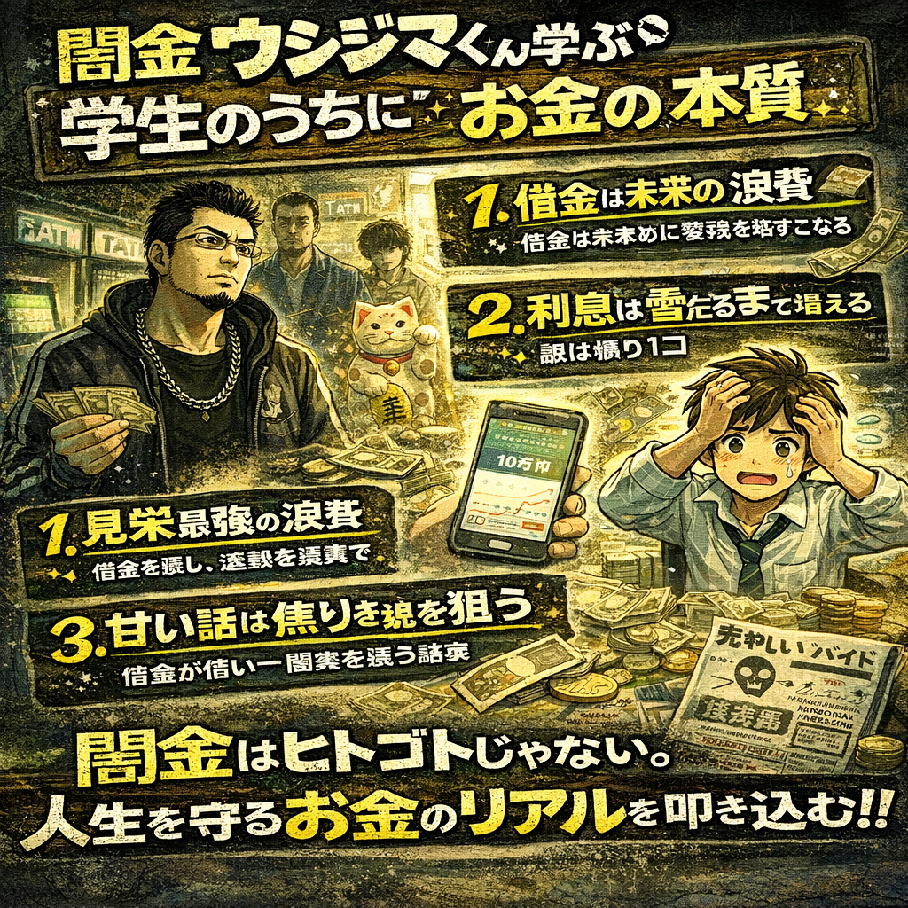 今日は、学生のうちに知っておくと人生が守られる「お金の本質」を、ウシジマくん風のリアルさで(でも安全に)まとめます。
