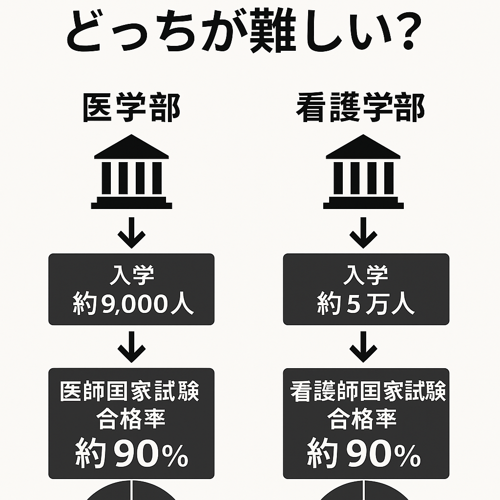 結論から言うと、医学部は入る方が圧倒的に難しいです。逆に、看護は入るより国家試験のほうがやや難しいという構造になっています。
