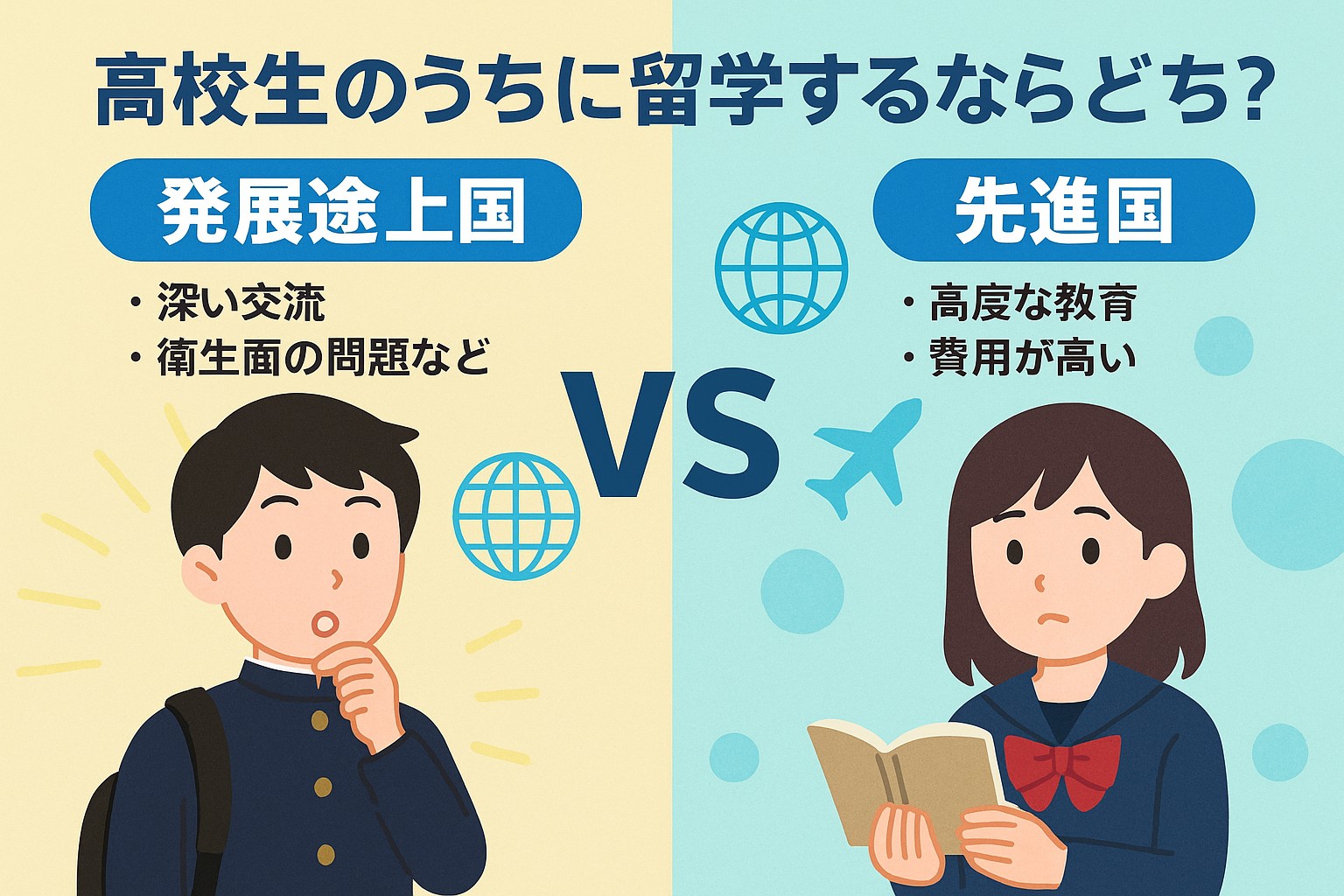 どちらも素晴らしい考え方です。でも実際に留学するとしたら、どんなメリットとデメリットがあるのか、わかりやすく整理してみましょう!