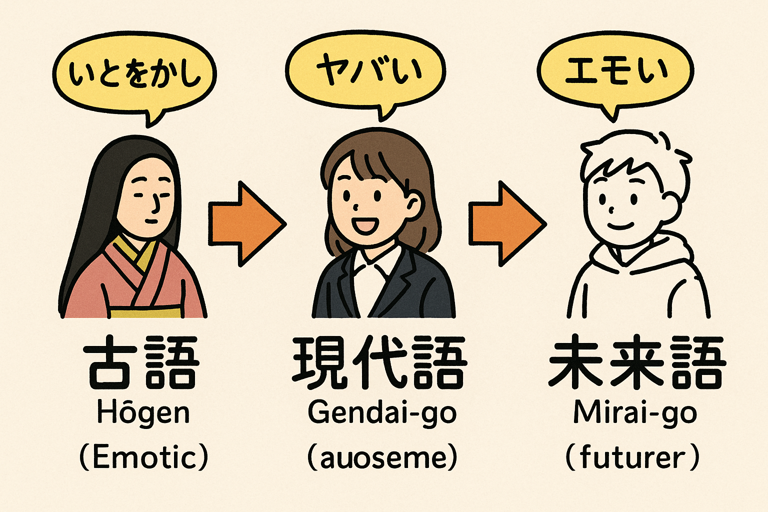 - 現代 → SNSや映像文化の影響を受けた「速くて感覚的な言葉」