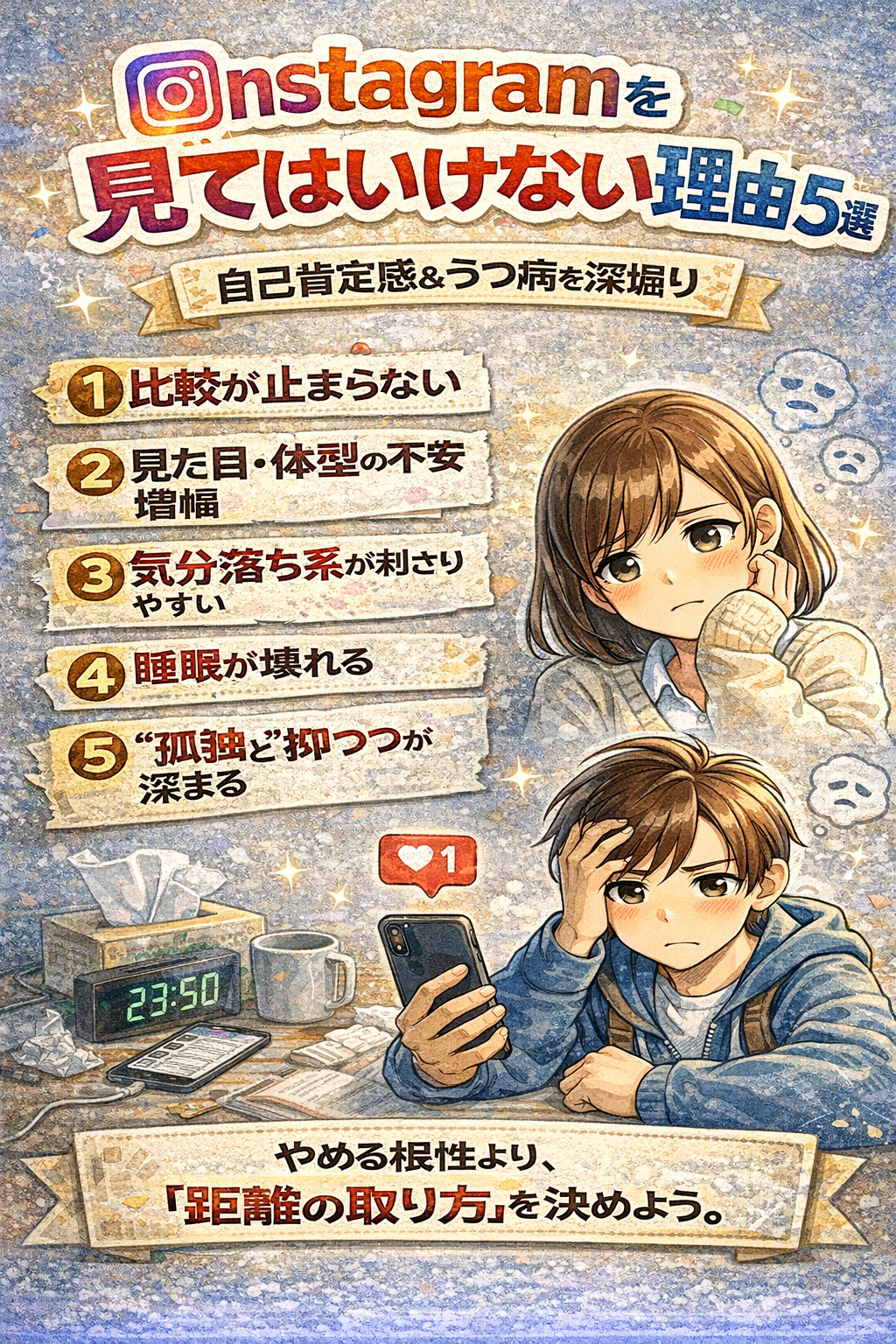 ここでは「Instagramを見てはいけない理由」を、自己肯定感の低下と**うつっぽさ(抑うつ症状)**の観点から、あえてはっきり5つにまとめます。